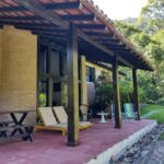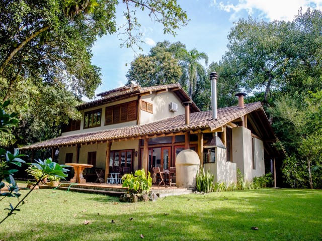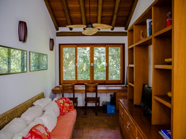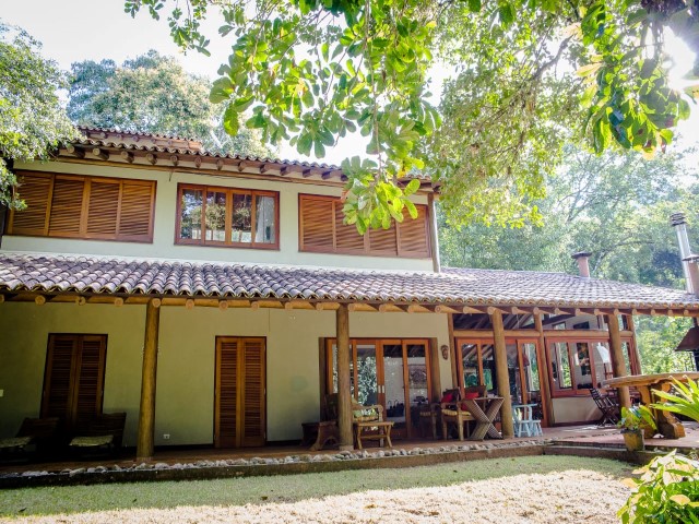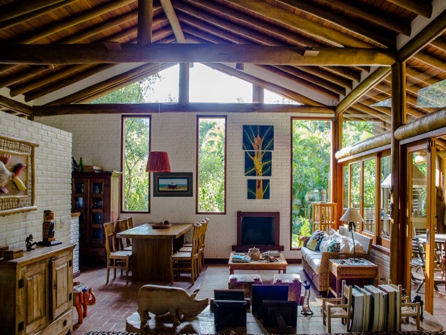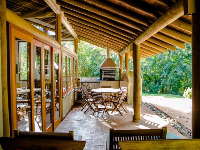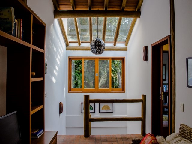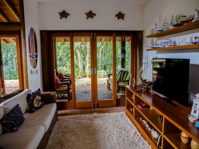 • Casa em frente ao mar com riozinho cortando o terreno localizada em meio a abundante vegetação, projeto de Fabio Madueño, com ampla área envidraçada aproveitando o visual da área verde no entorno e redário no gramado a beira do riozinho.