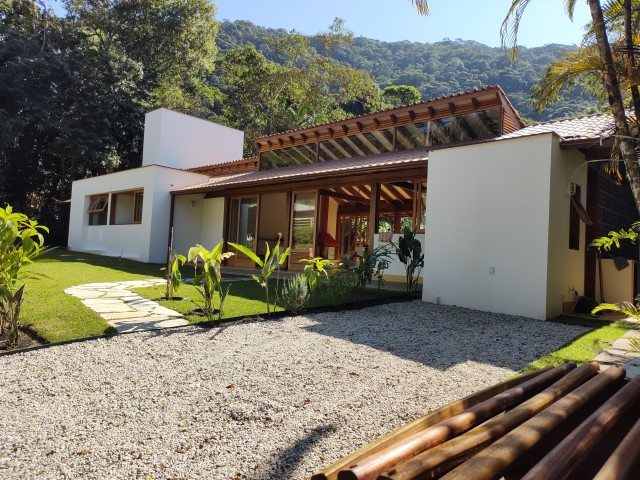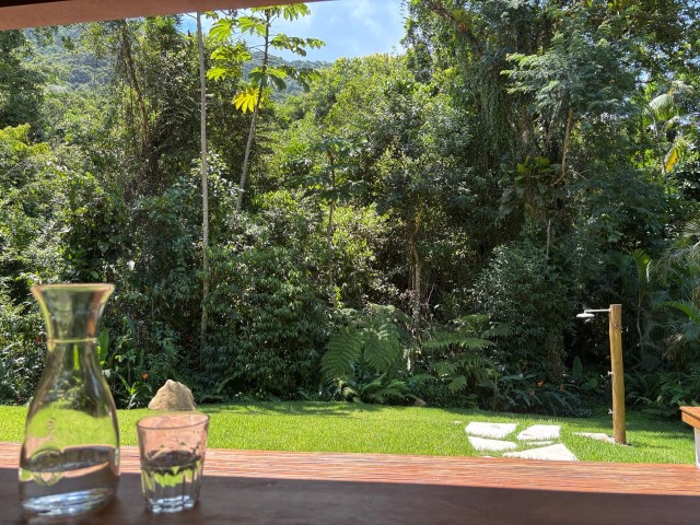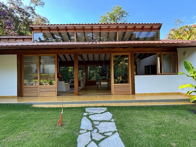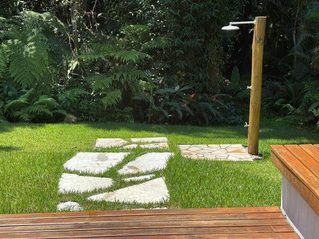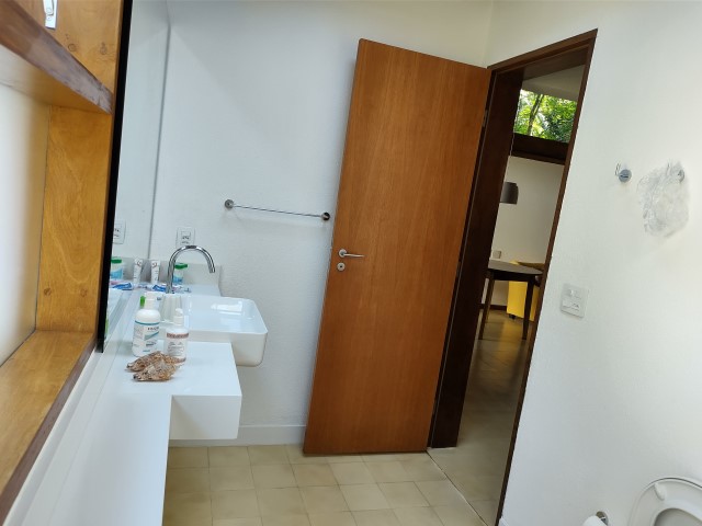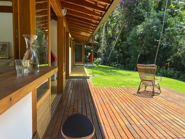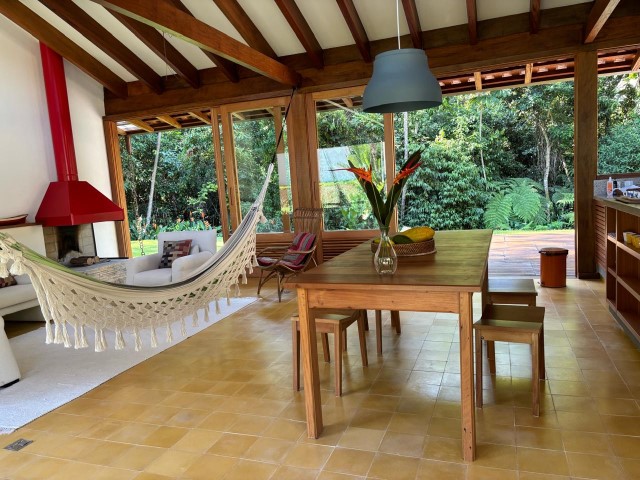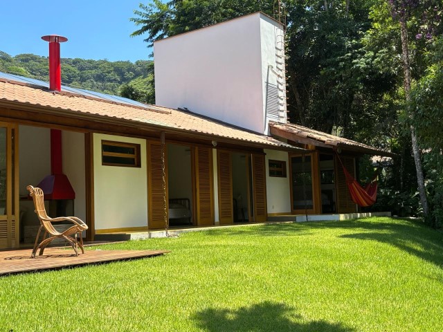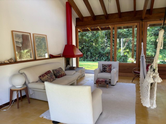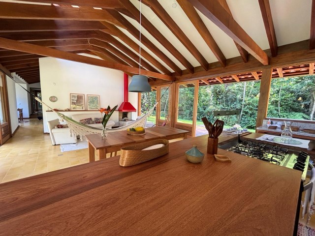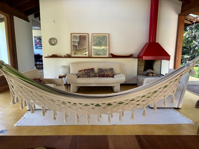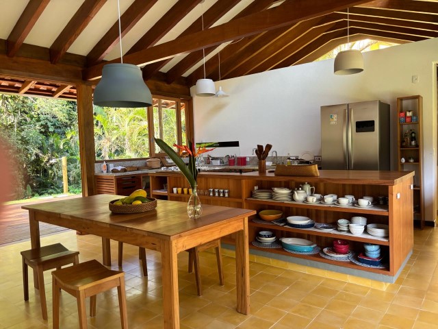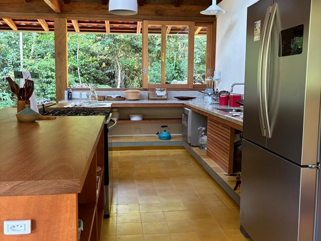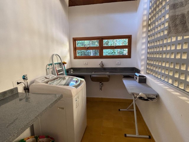 - Sala de estar com sofás, TV e lareira, conjugada com jantar, cozinha e bar, 1 geladeira (side by side), fogão 5 bocas com grill, microondas, lava-pratos, despensa com demais utensílios de cozinha, churrasqueira portátil, lavanderia c / lavadora de roupas e varal, 6 cadeiras de praia e amplo jardim dando para área verde.