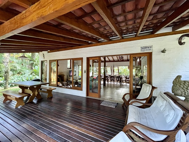 - Varanda mobiliada com churrasqueira portátil, 2 redes, deck, mesa e bancos.