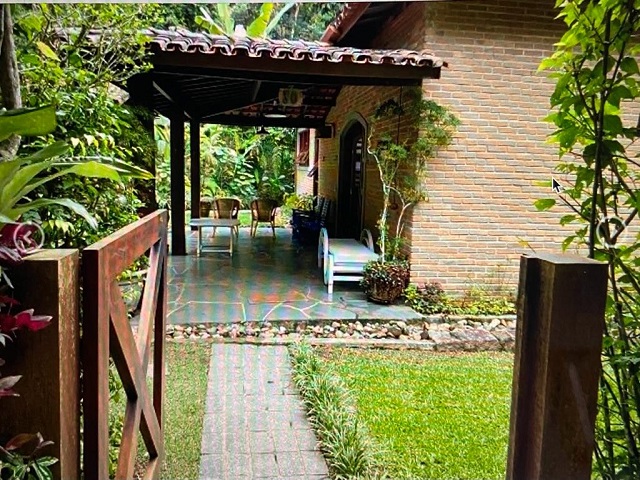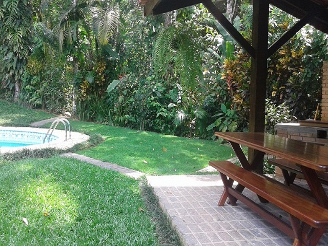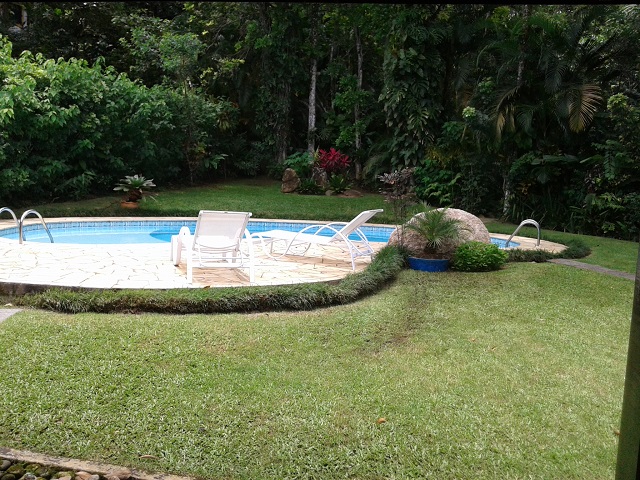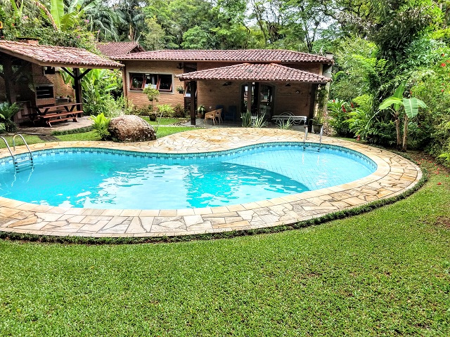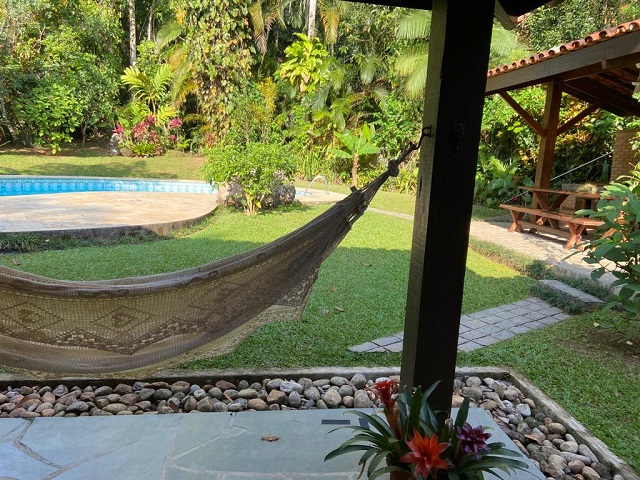 - Varanda com 4 redes, Piscina, churrasqueira coberta com mesa e bancos, lavabo, jardim c / área verde nos fundos.