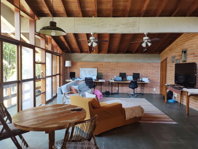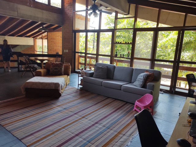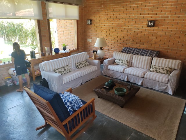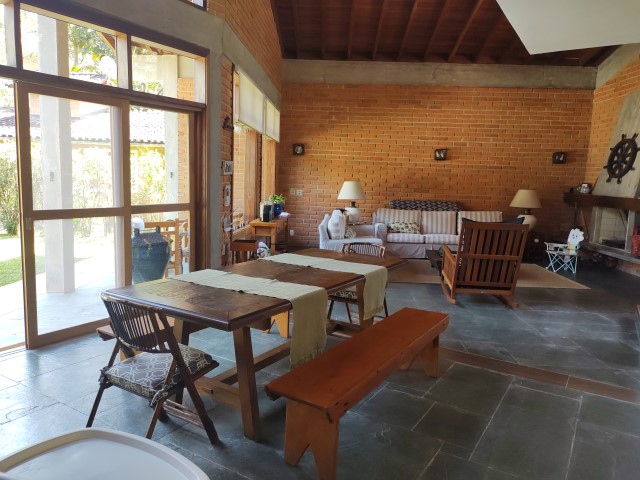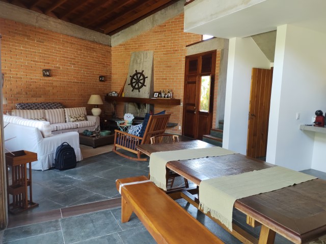 - Sala de jantar conjugada com estar, sofás, mesa de centro, mesa de jantar com 2 bancos