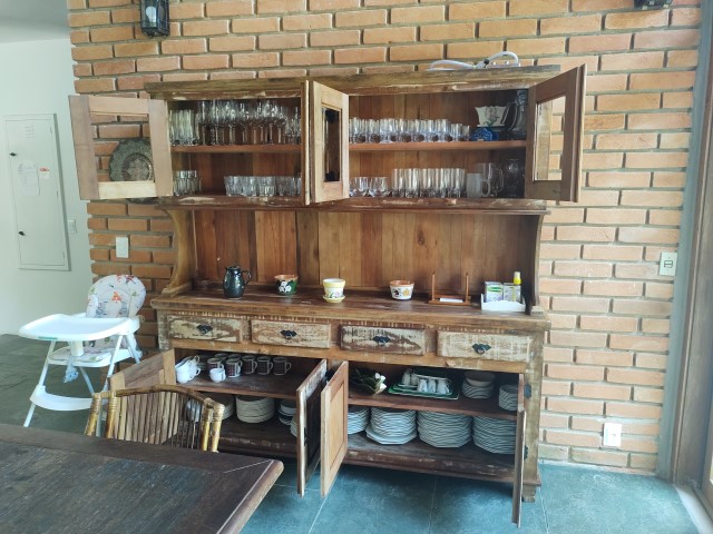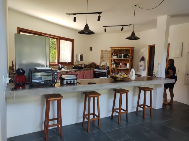 - Cozinha com balcão/bar com banquetas, 1 geladeira duplex, fogão 5 bcs, microondas, liquidificador, sanduicheira, cafeteira dolce gusto, lava louças e demais utensílios de cozinha