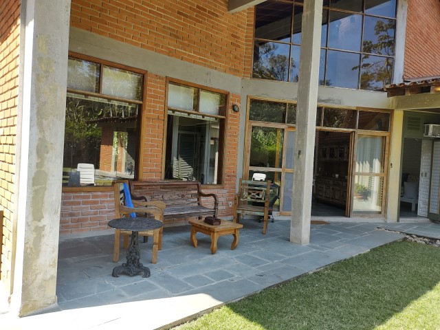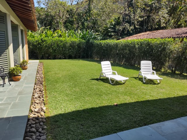 - Varanda com churrasqueira portátil, poltronas e amplo jardim